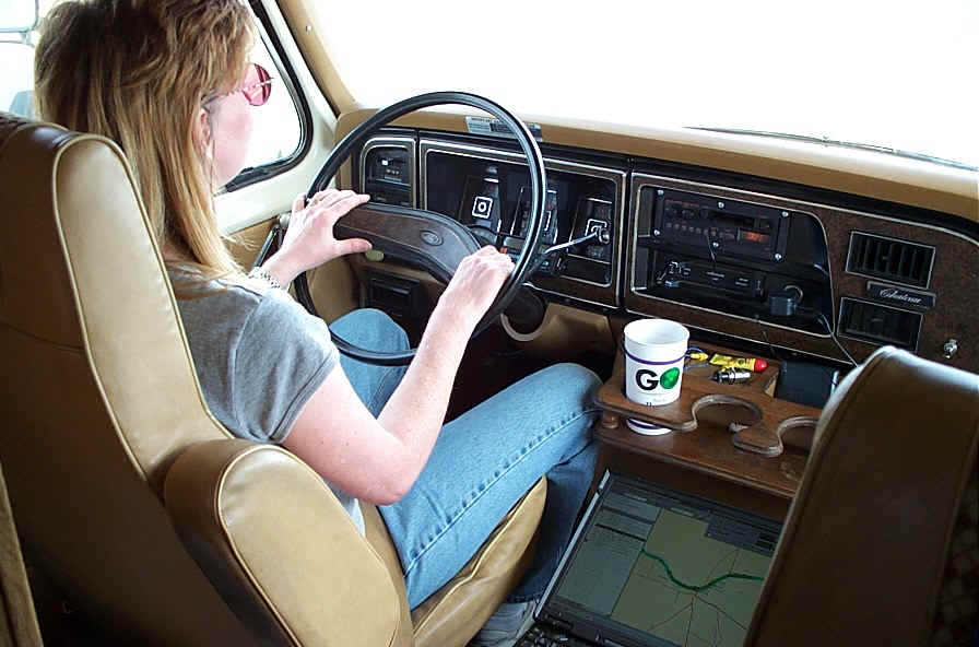 | Lori at the wheel with the GPS showing her the way. I don't think we