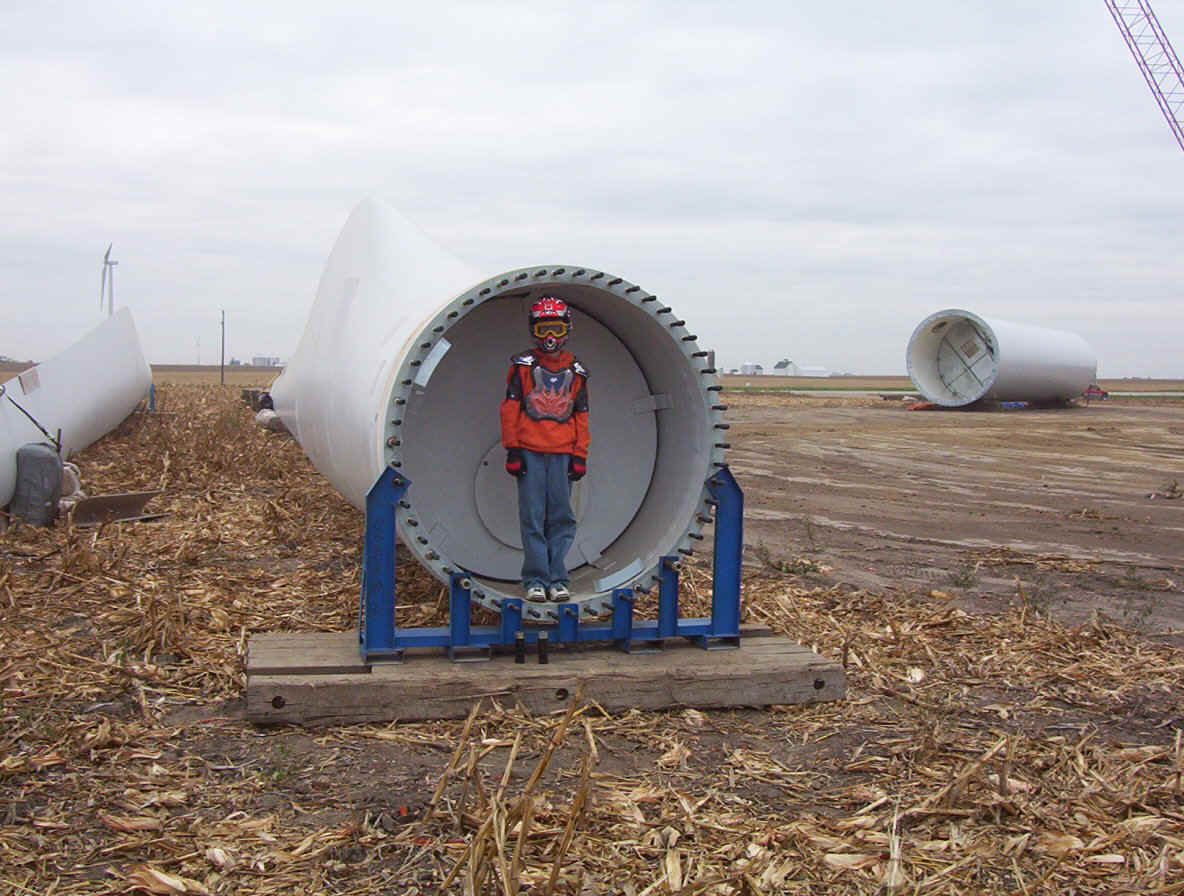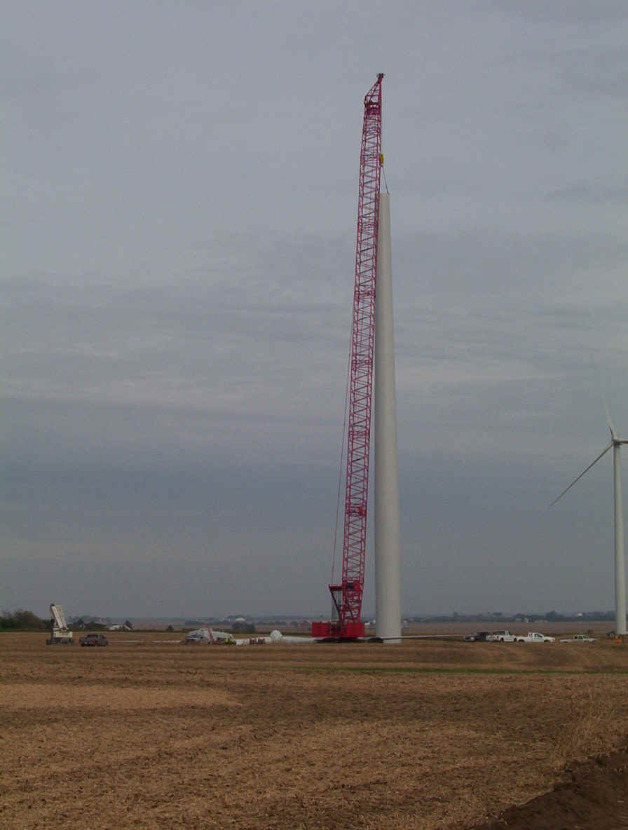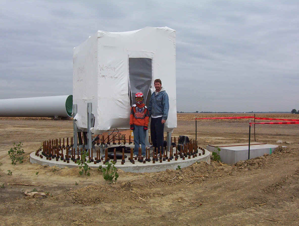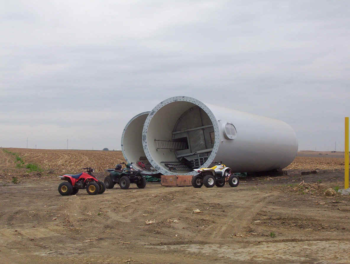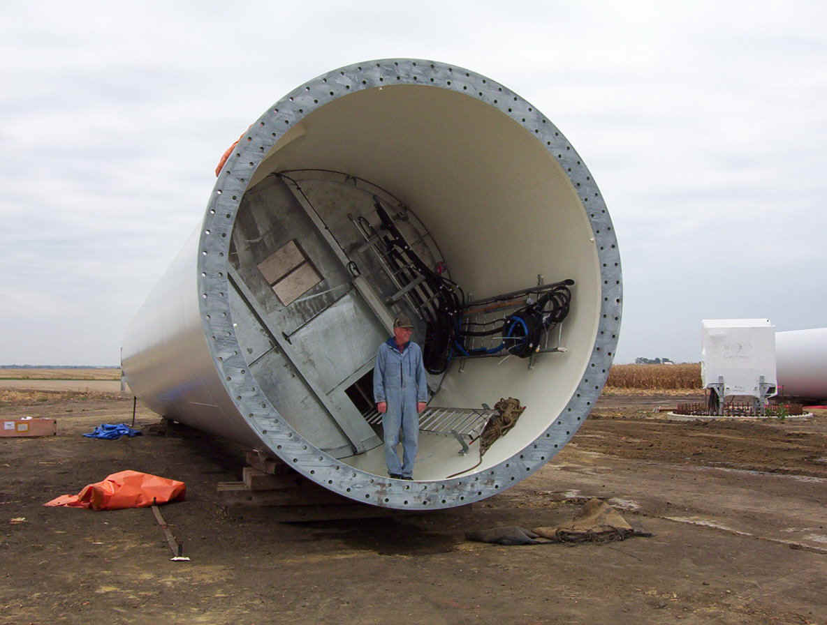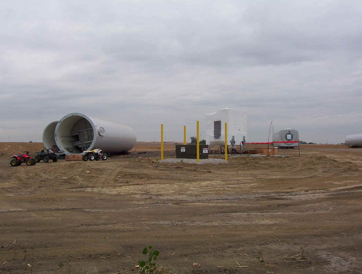 Once the base is built, the transformers are set in place. The tower is made up of three pieces and sit over the transformers. While the tower is being erected, the props are assembled together on the ground and then hoisted up as one unit. The towers are 265 feet tall and each blade is over 120 feet long. The actual generator that sits on top of the tower is the size of a small bus. A ladder system runs up the inside of the tower for maintenance and repair access.