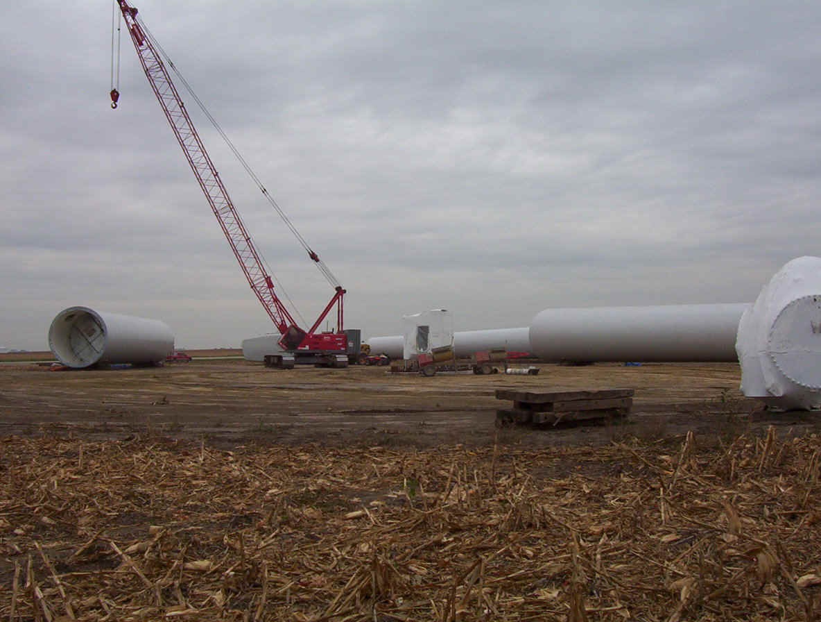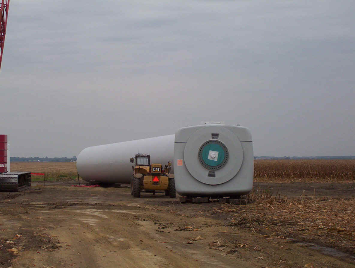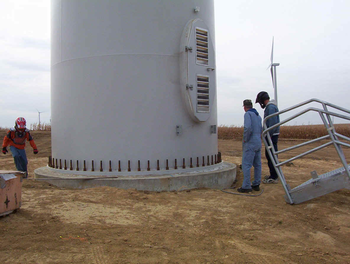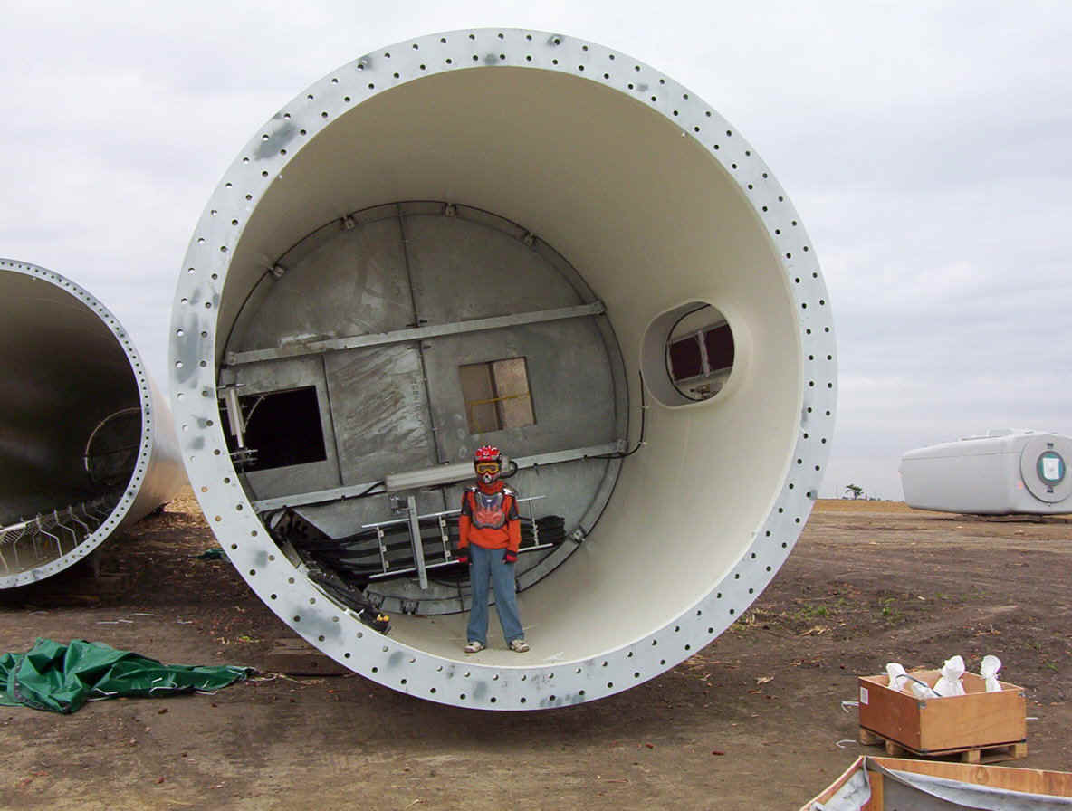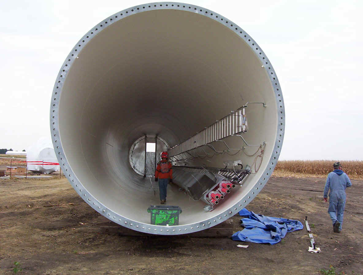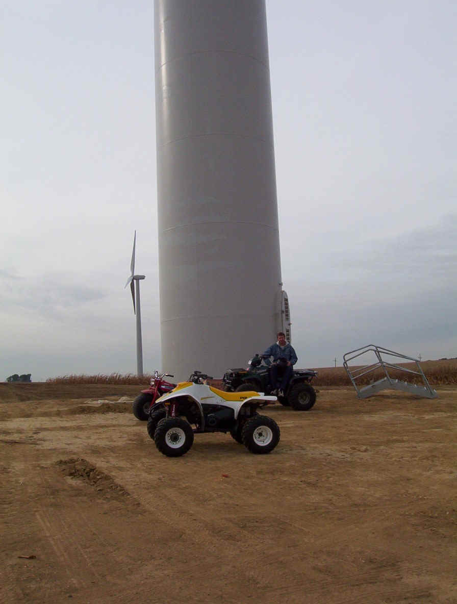 Once the base is built, the transformers are set in place. The tower is made up of three pieces and sit over the transformers. While the tower is being erected, the props are assembled together on the ground and then hoisted up as one unit. The towers are 265 feet tall and each blade is over 120 feet long. The actual generator that sits on top of the tower is the size of a small bus. A ladder system runs up the inside of the tower for maintenance and repair access.