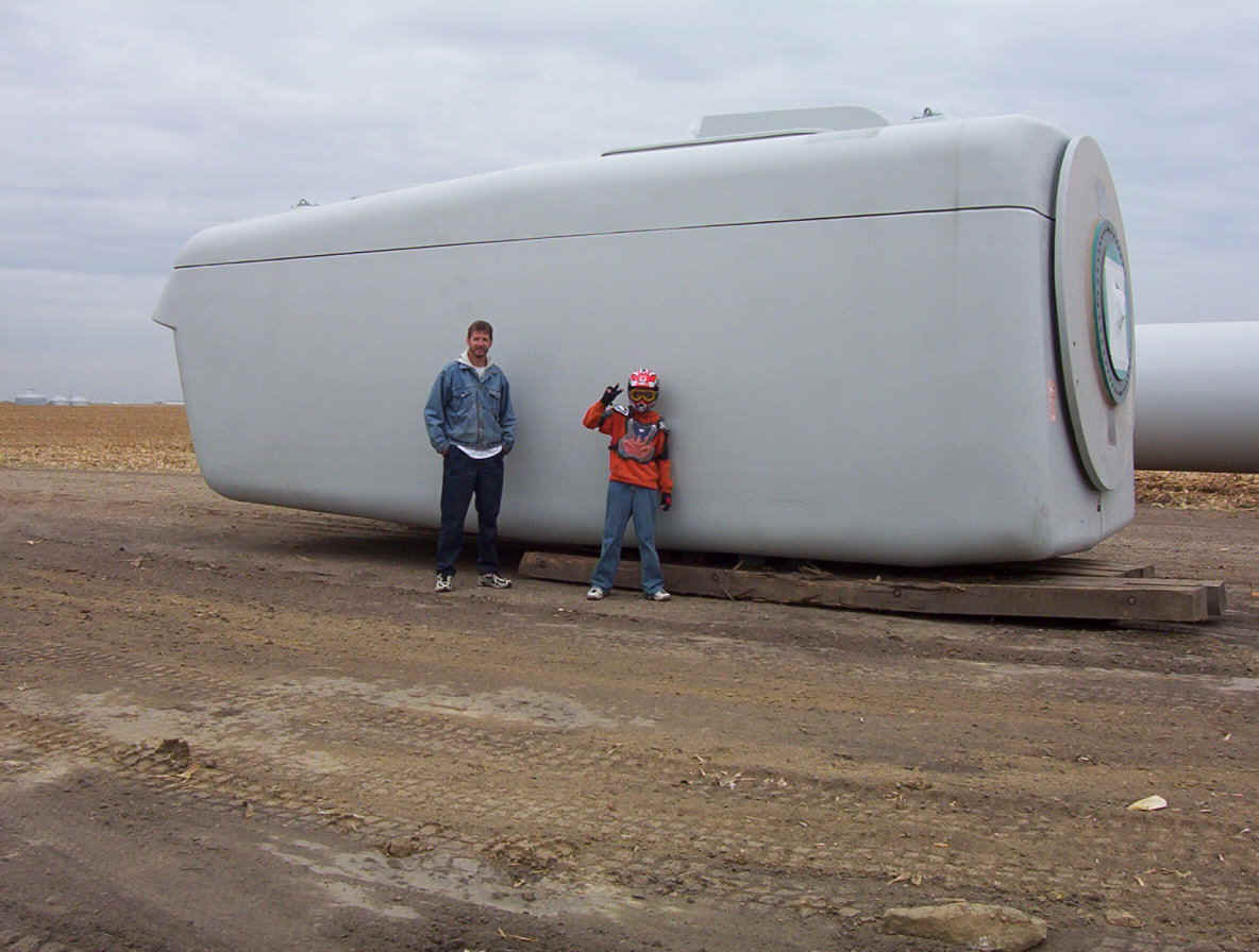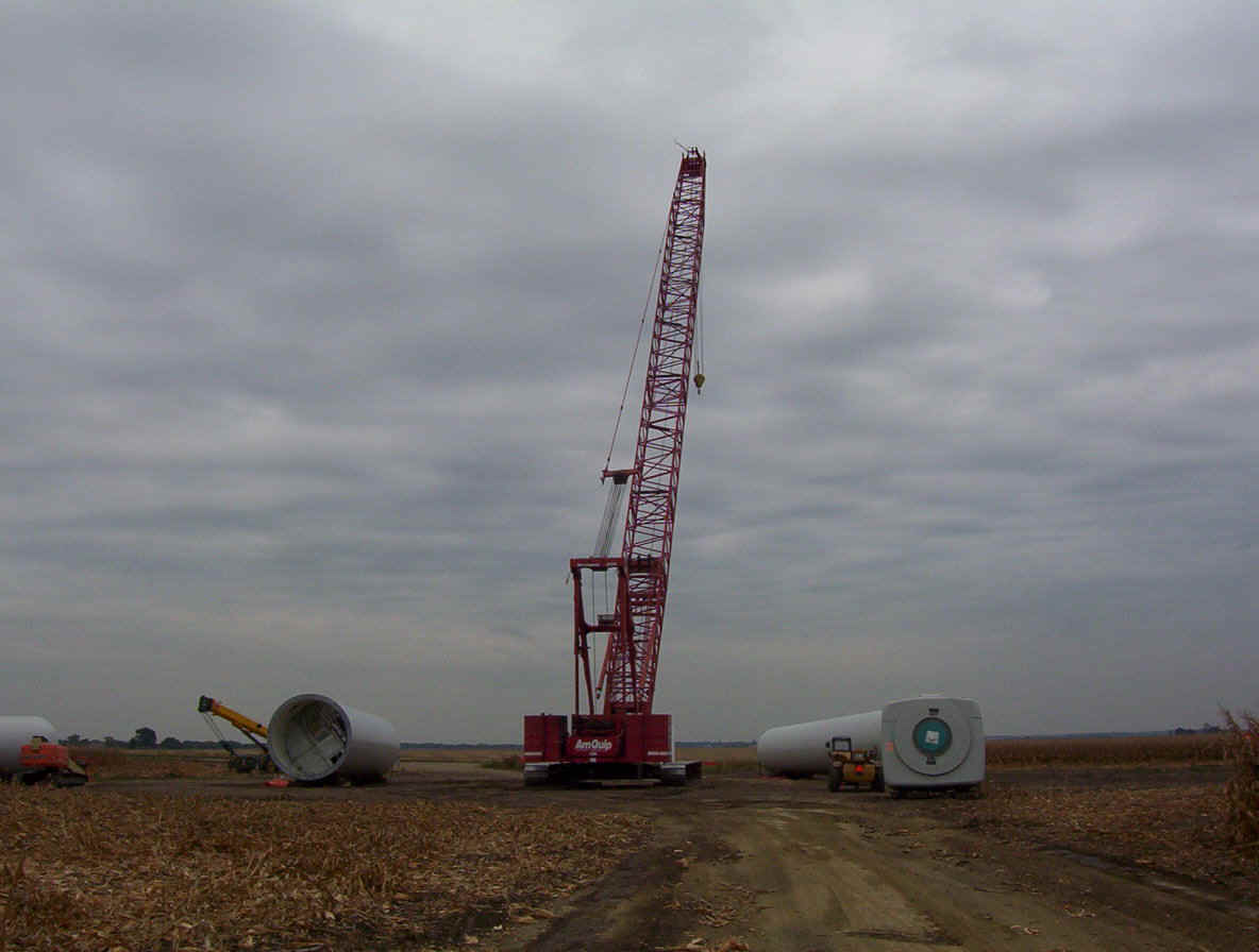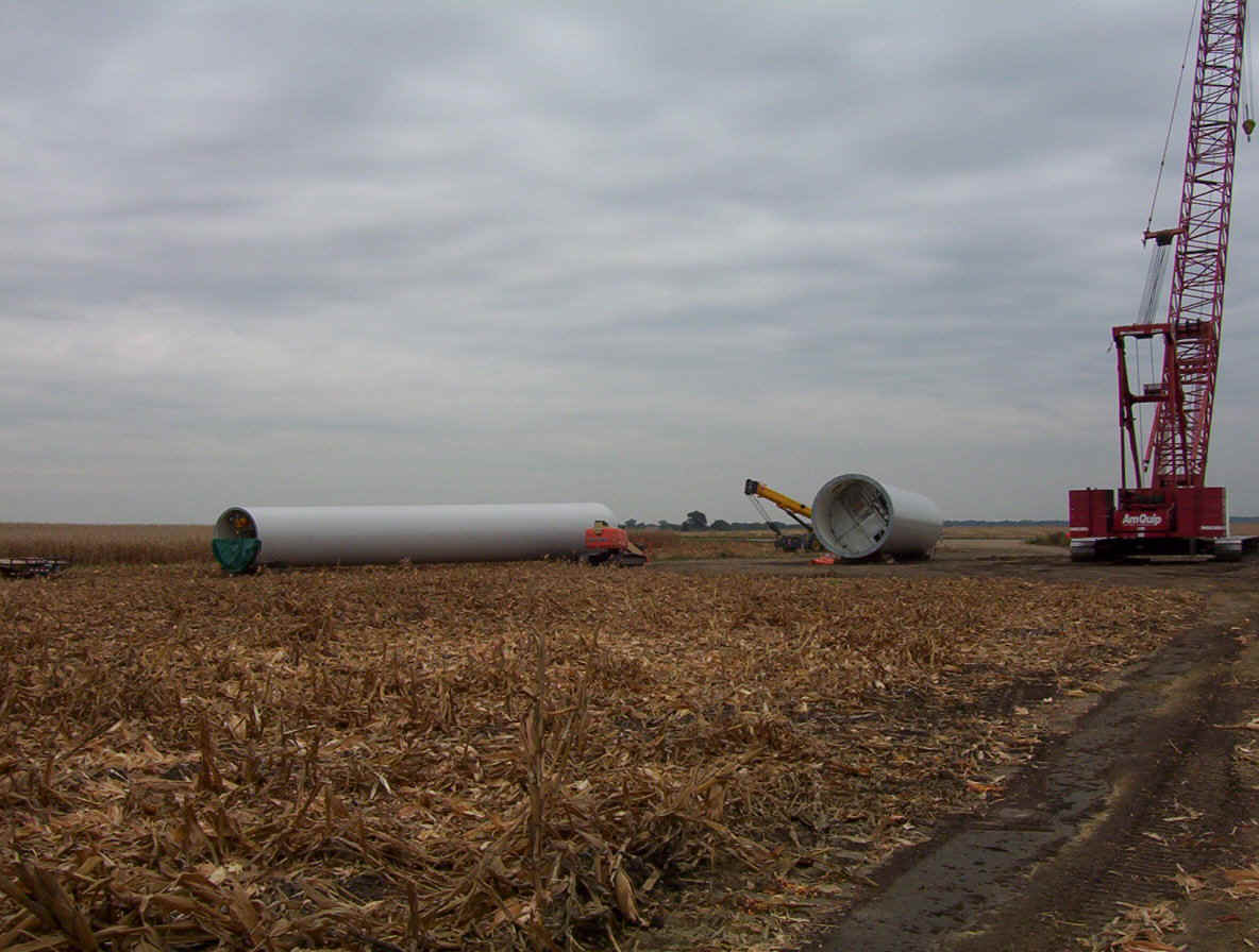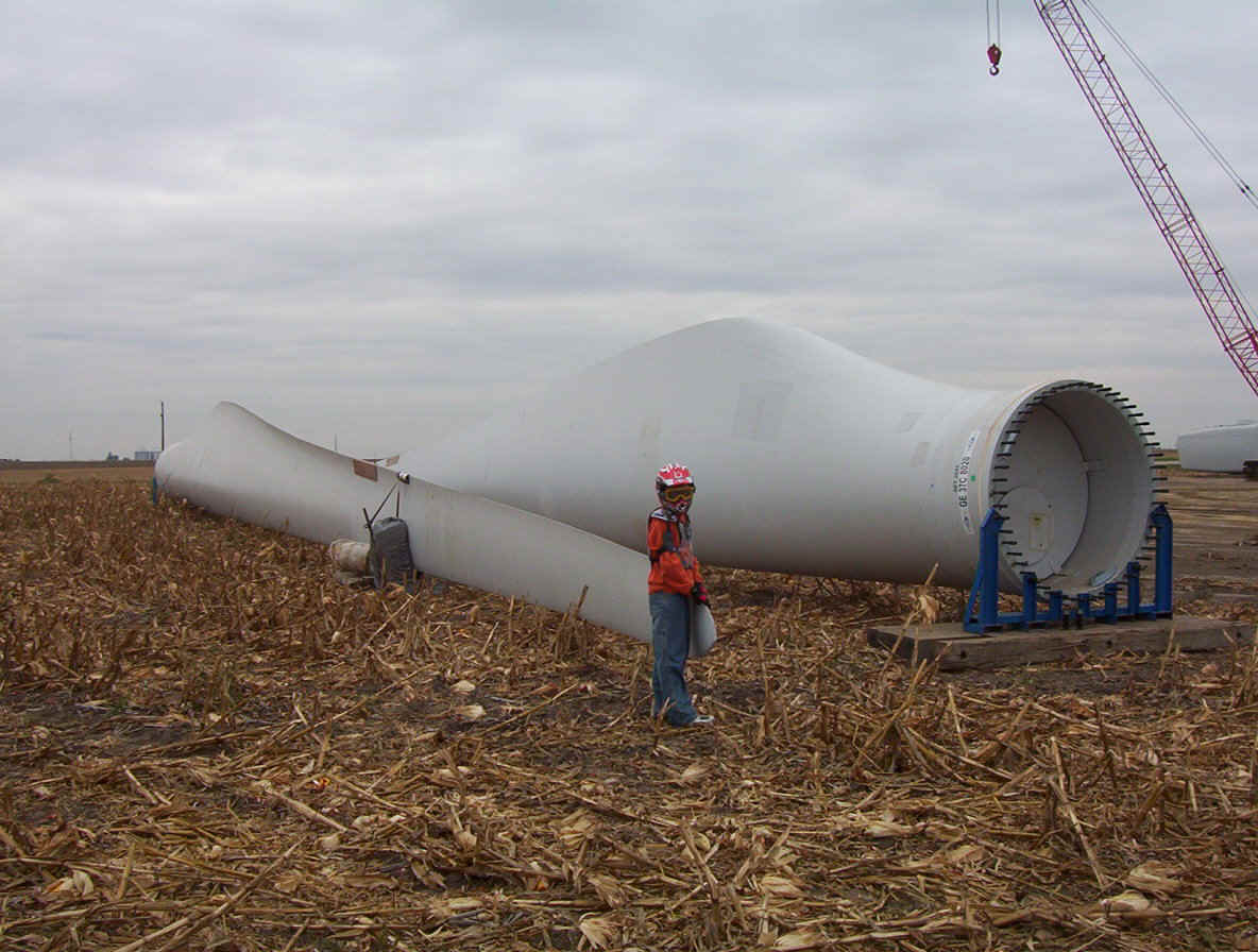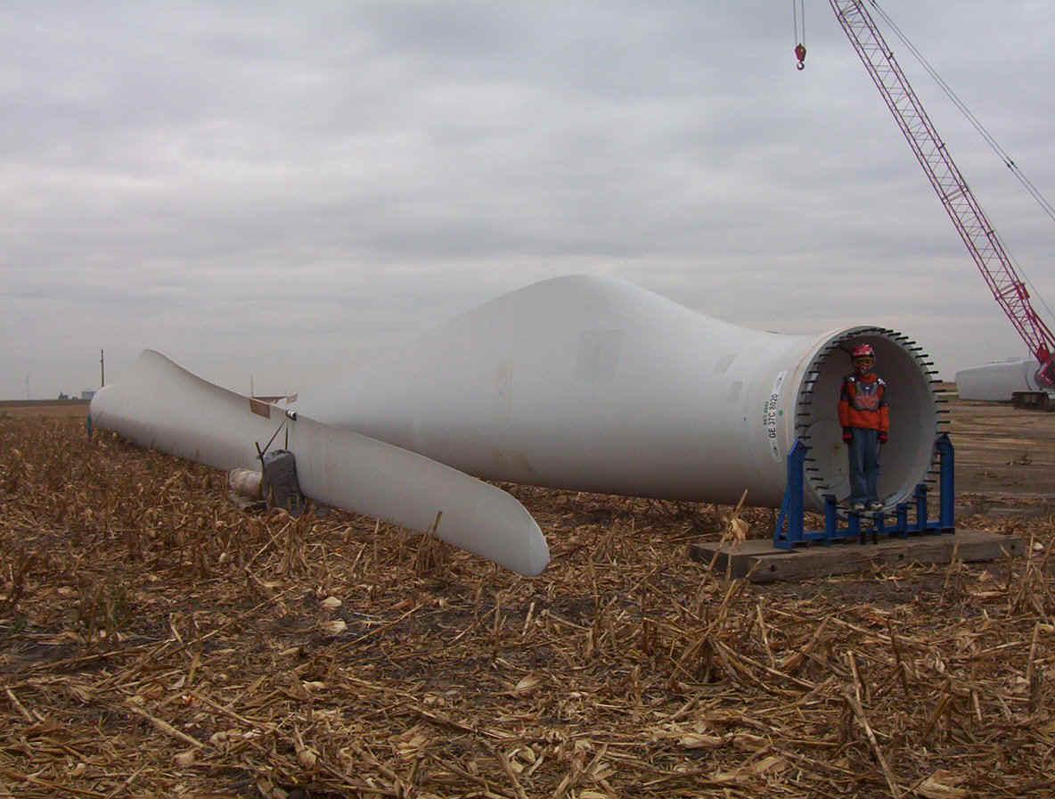 Once the base is built, the transformers are set in place. The tower is made up of three pieces and sit over the transformers. While the tower is being erected, the props are assembled together on the ground and then hoisted up as one unit. The towers are 265 feet tall and each blade is over 120 feet long. The actual generator that sits on top of the tower is the size of a small bus. A ladder system runs up the inside of the tower for maintenance and repair access.