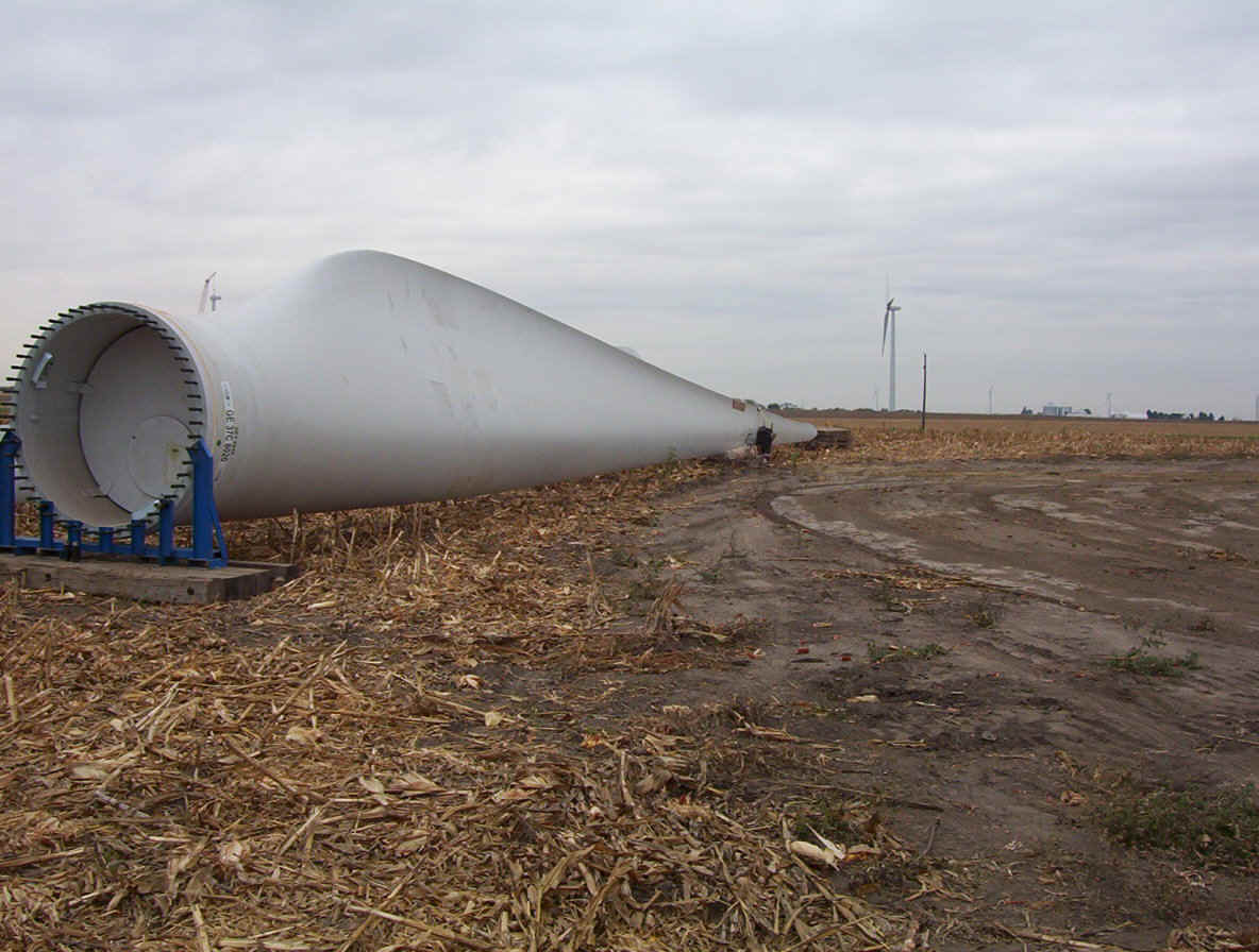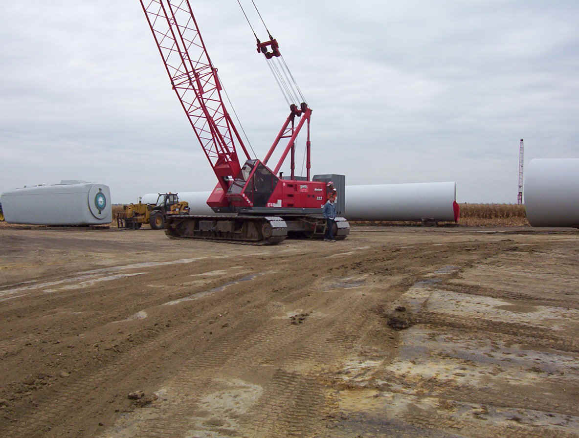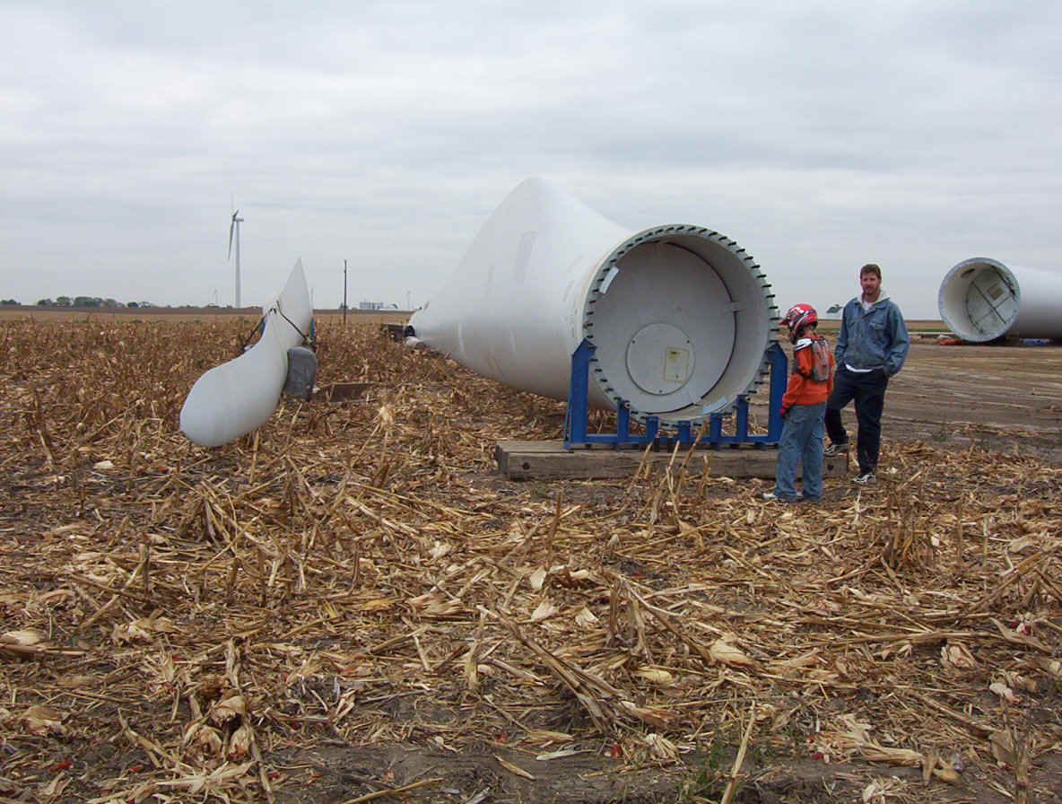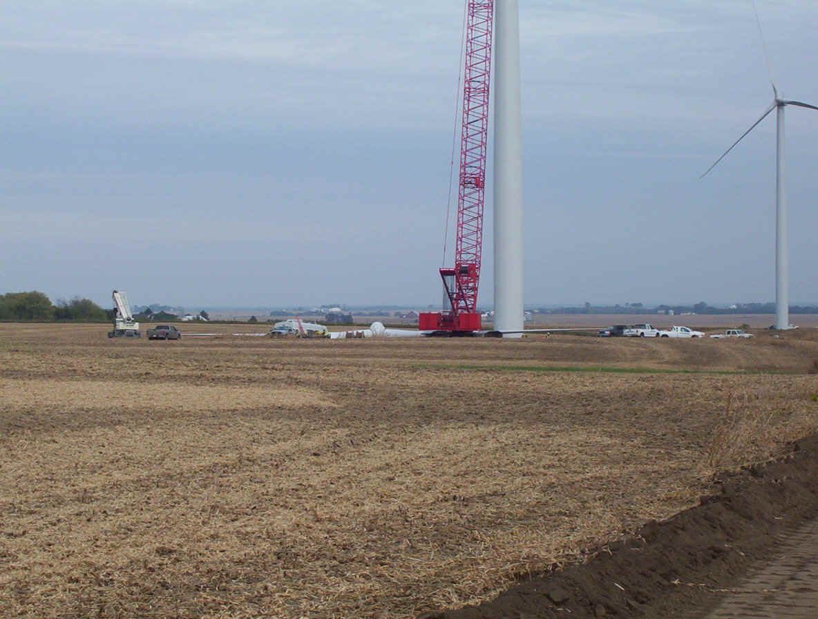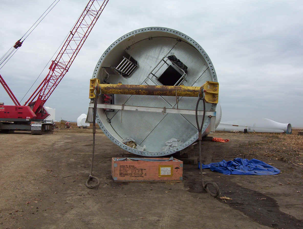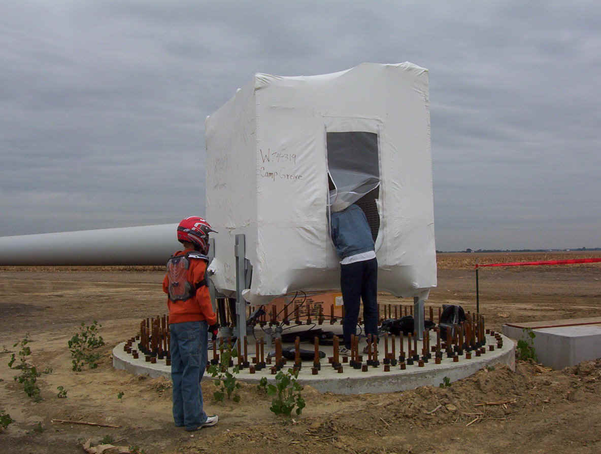 Once the base is built, the transformers are set in place. The tower is made up of three pieces and sit over the transformers. While the tower is being erected, the props are assembled together on the ground and then hoisted up as one unit. The towers are 265 feet tall and each blade is over 120 feet long. The actual generator that sits on top of the tower is the size of a small bus. A ladder system runs up the inside of the tower for maintenance and repair access.