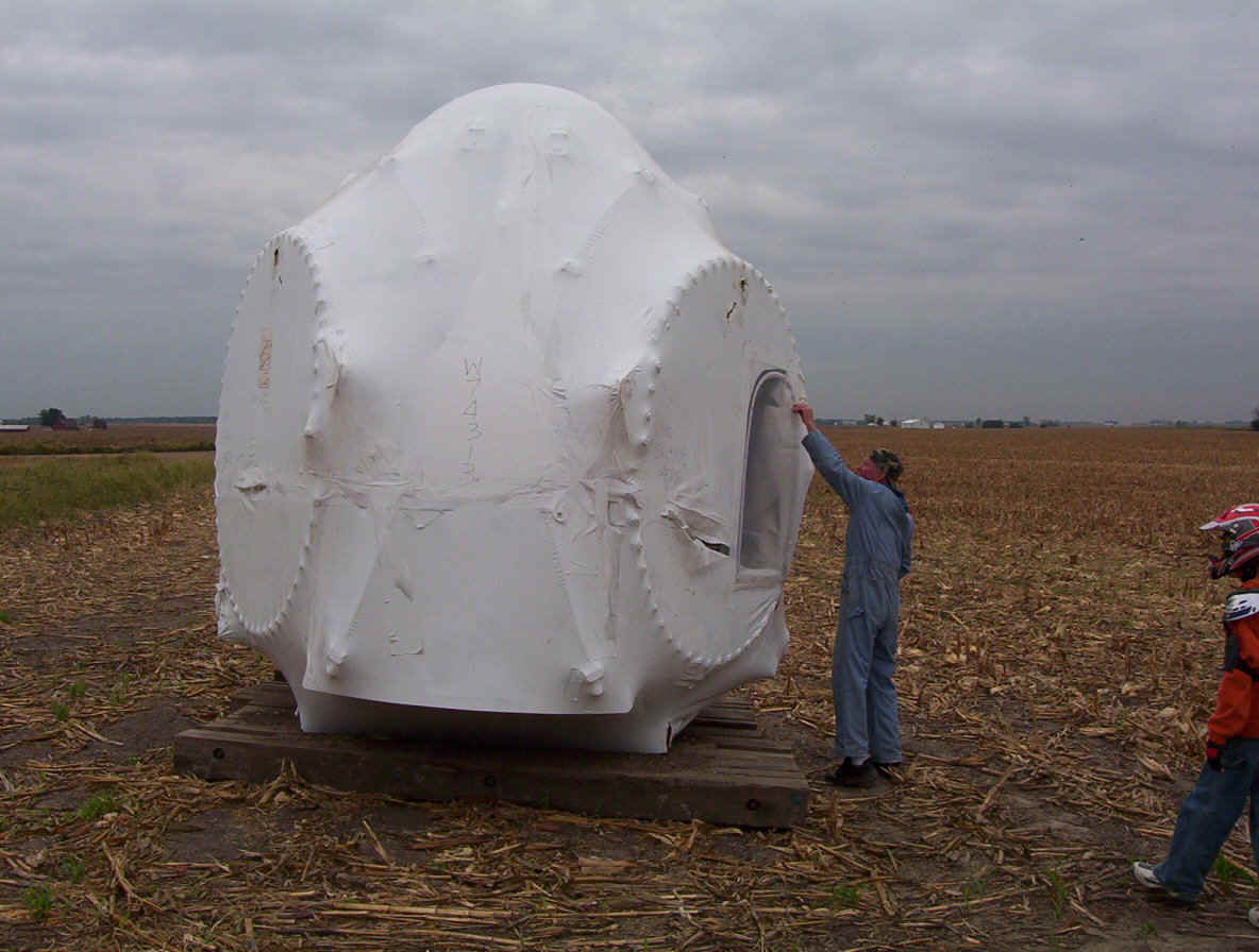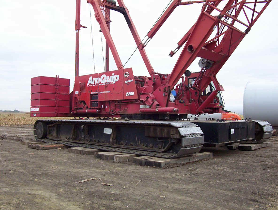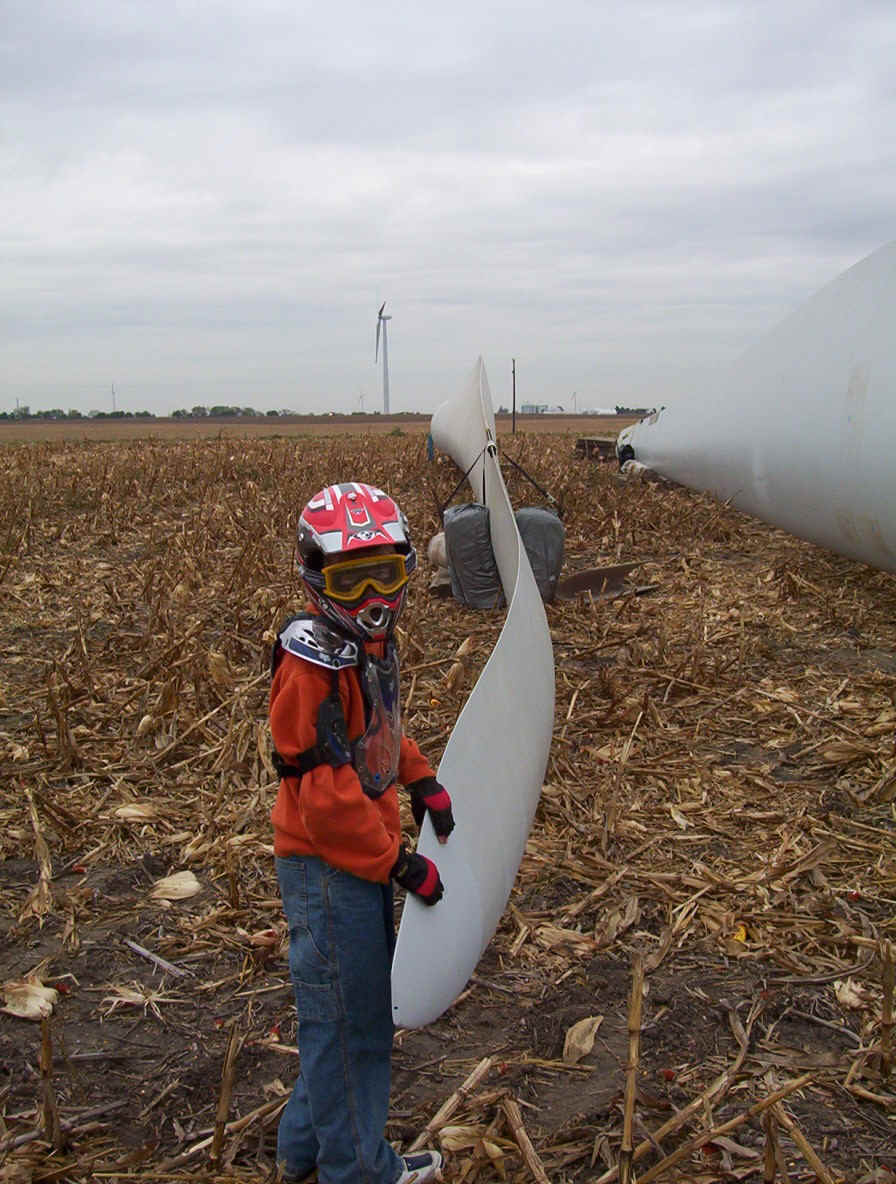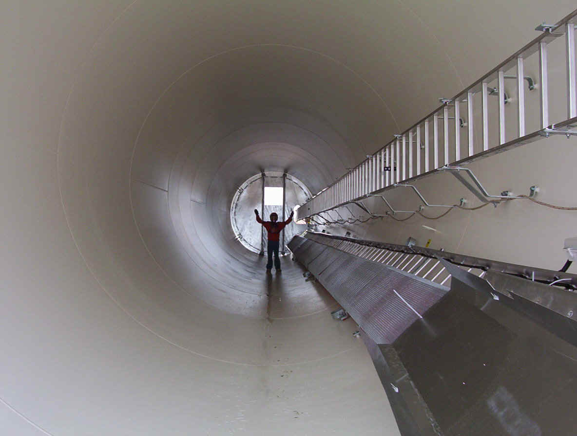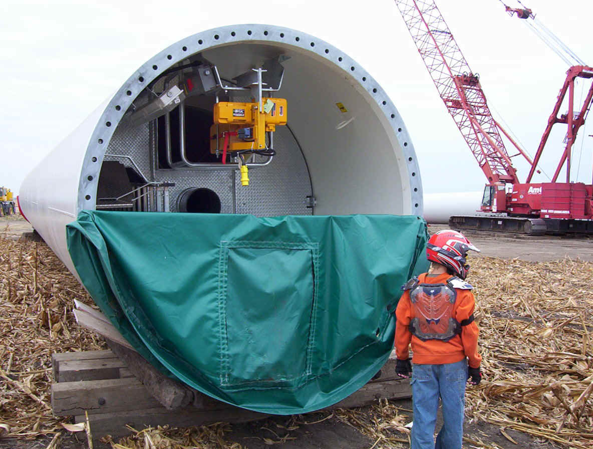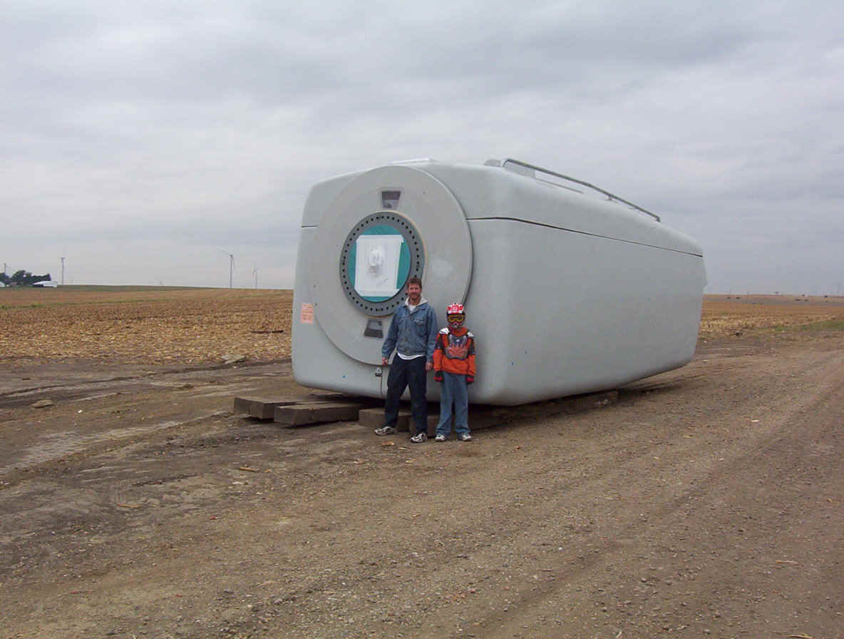 Once the base is built, the transformers are set in place. The tower is made up of three pieces and sit over the transformers. While the tower is being erected, the props are assembled together on the ground and then hoisted up as one unit. The towers are 265 feet tall and each blade is over 120 feet long. The actual generator that sits on top of the tower is the size of a small bus. A ladder system runs up the inside of the tower for maintenance and repair access.