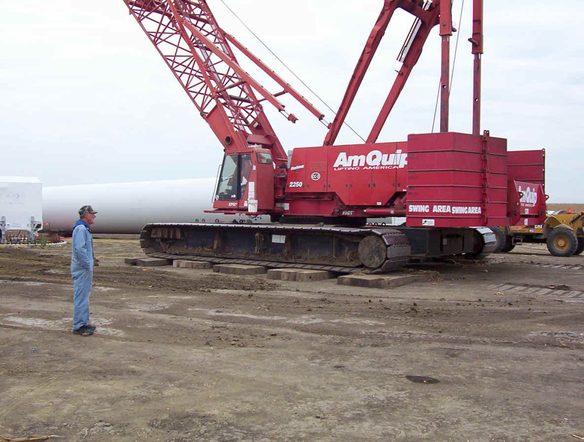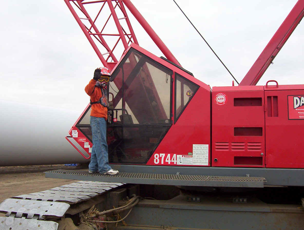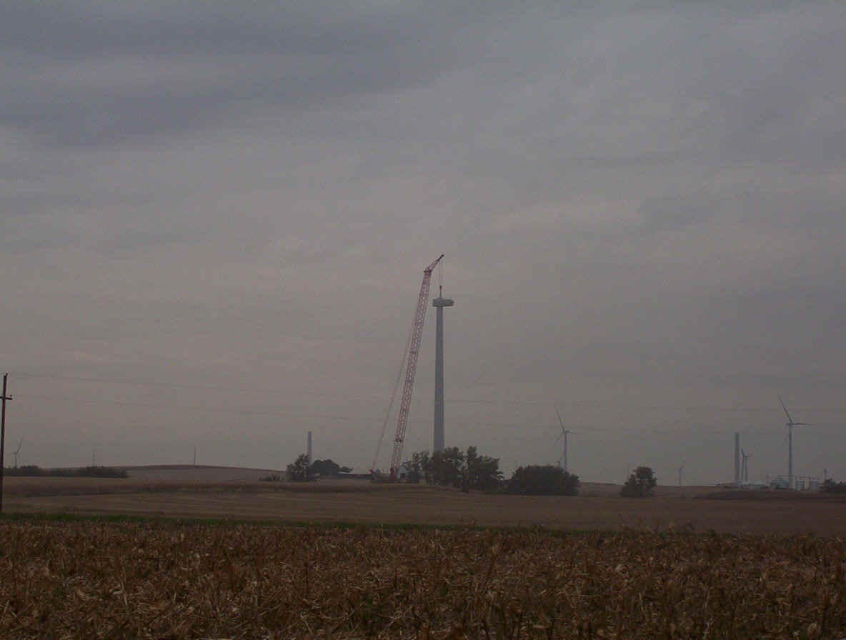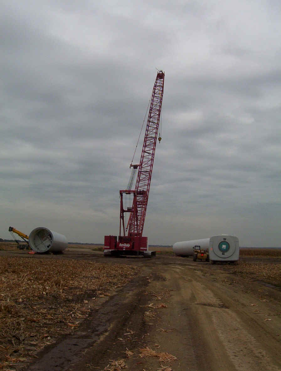 This contractor is working around the clock to get these up and running before Jan 1st so he can qualify for a special government grant worth millions. He has three cranes running at a cost of $70,000 per month each for rental. Most of the work up high is done at night when the winds are at thier lowest. Once the pad is formed, it takes about three days to complete a tower. The generator was raised and mounted within two hours while we were there.